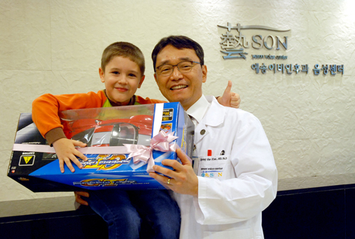 .jpg) 약 4년 동안 목소리없이 살았던 5살 우크라이나 소년, 예고르의 2014 하반기 예송 러시아 나눔 의료 프로젝트가 성공리에 마쳤습니다. 우크라이나에서 온 예고르(Yegor Moskalenko, 5세 남)는 러시아나 중국 등에서는 계속되는 재발로 난치성 질환으로 잘 알려진 소아형 후두유두종을 생후 9개월 때 진단받았습니다. 소아형 후두유두종으로 2살 때부터 자가(自家)호흡이 어려워 기관절개술로 기도에 삽입한 관(tube)으로 최근까지 호흡해왔었습니다. 반복되는 재발로 러시아, 독일, 이스라엘 등의 해외대형병원에서 23번 넘게 수술을 받았습니다. 하지만, “이 병에는 완치가 없으니까 예고르는 평생 튜브로 숨을 쉴 거다.”라는 말 만 들었습니다. 그 동안 예고르는 목소리도 안 나와서 말을 제대로 못 배워서 잘 못해 예고르의 부모는 예고르의 목소리도, 희망도 잃고 있었습니다. 하지만, 지난해 2월 처음 예송이비인후과에서 미세후두수술과 PDL성대수술을 통해 후두유두종을 제거하고 2개월만 목소리가 나와 아들의 완치에 대한 희망을 되찾았습니다. 예송이비인후과에서의 첫 수술 후 재발 없이 완치 단계에 이르러 이번 나눔 의료를 통해서 기도 삽관으로 호흡했던 관(tube)또한 제거했습니다.