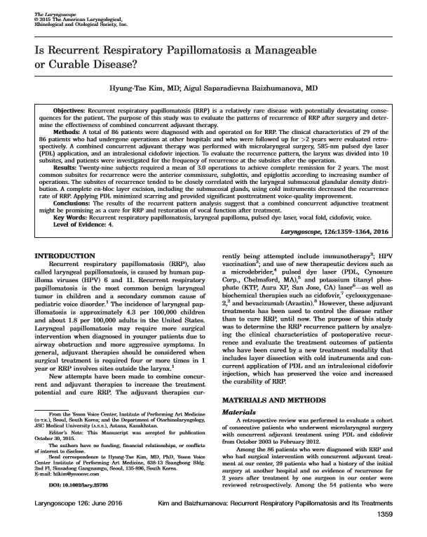 후두유두종의 완치가능성 연구논문 발표 예송이비인후과 음성센터 김형태 원장은 후두유두종 제거 수술 이후의 재발 패턴 발견과 이에 따른 임상적인 치료결과에 대한 연구논문을 이비인후과 분야의 국제학술지 중 가장 권위 있고 최고의 학술지라고 평가 받는 ‘the Laryngoscope’에 논문 발표를 했습니다. 이는 후두유두종의 완치가능성을 알린 최초의 논문입니다. 논문은 지난 8년 4개월 동안 총 86명의 후두유두종 환자를 대상으로 이루어진 연구이며 환자들의 질병 재발 패턴 분석 결과 새로운 수술 방법과 함께 보조치료요법을 병행할 때 후두유두종의 완치 가능성은 높아진다는 결과를 보여주고 있습니다. 연구논문제목 : Is Recurrent Respiratory Papillomatosis a Manageable or Curable Disease? 논문지명 : Laryngoscope, 126:1359–1364, 2016 요약 : Objectives: Recurrent respiratory papillomatosis (RRP) is a relatively rare disease with potentially devastating consequences for the patient. The purpose of this study was to evaluate the patterns of recurrence of RRP after surgery and determine the effectiveness of combined concurrent adjuvant therapy. Methods: A total of 86 patients were diagnosed with and operated on for RRP. The clinical characteristics of 29 of the 86 patients who had undergone operations at other hospitals and who were followed up for >2 years were evaluated retrospectively. A combined concurrent adjuvant therapy was performed with microlaryngeal surgery, 585-nm pulsed dye laser (PDL) application, and an intralesional cidofovir injection. To evaluate the recurrence pattern, the larynx was divided into 10 subsites, and patients were investigated for the frequency of recurrence at the subsites after the operation. Results: Twenty-nine subjects required a mean of 3.0 operations to achieve complete remission for 2 years. The most common subsites for recurrence were the anterior commissure, subglottis, and epiglottis according to increasing number of operations. The subsites of recurrence tended to be closely correlated with the laryngeal submucosal glandular density distribution. A complete en-bloc layer excision, including the submucosal glands, using cold instruments decreased the recurrence rate of RRP. Applying PDL minimized scarring and provided significant posttreatment voice-quality improvement. Conclusions: The results of the recurrent pattern analysis suggest that a combined concurrent adjunctive treatment might be promising as a cure for RRP and restoration of vocal function after treatment.