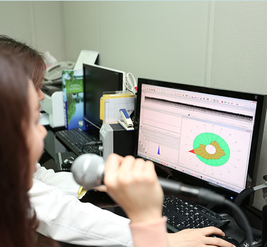 음향학적 검사는 성대움직임의 특징을 나타내는 각 음성지표를 측정하여 성대의 전반적인 발성상태를 측정하는 검사입니다.
